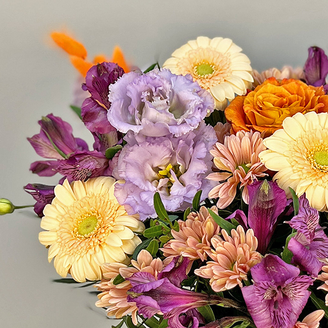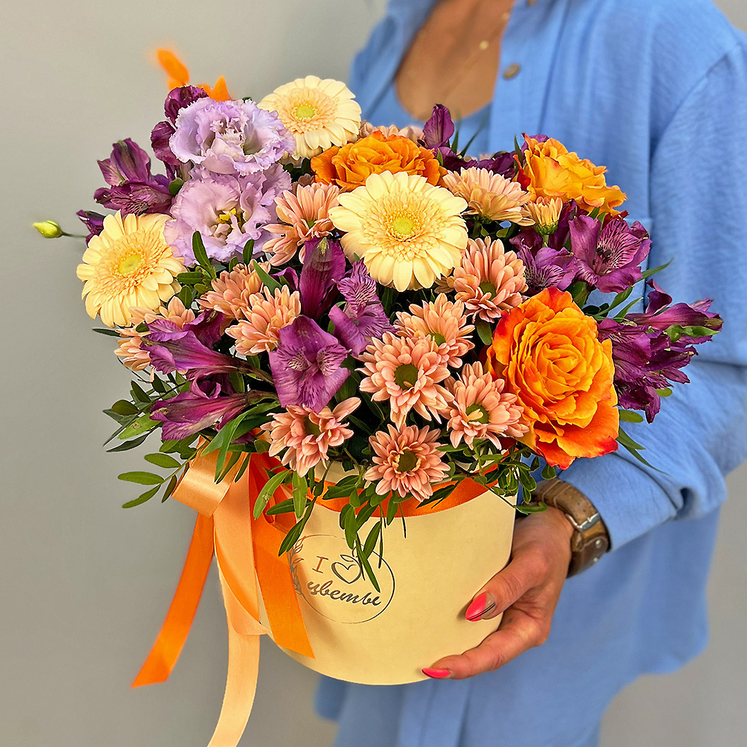 • Коробка с цветами "Тропический коктейль" из Эквадорской розы, эустомы, альстромерии арт. 22456