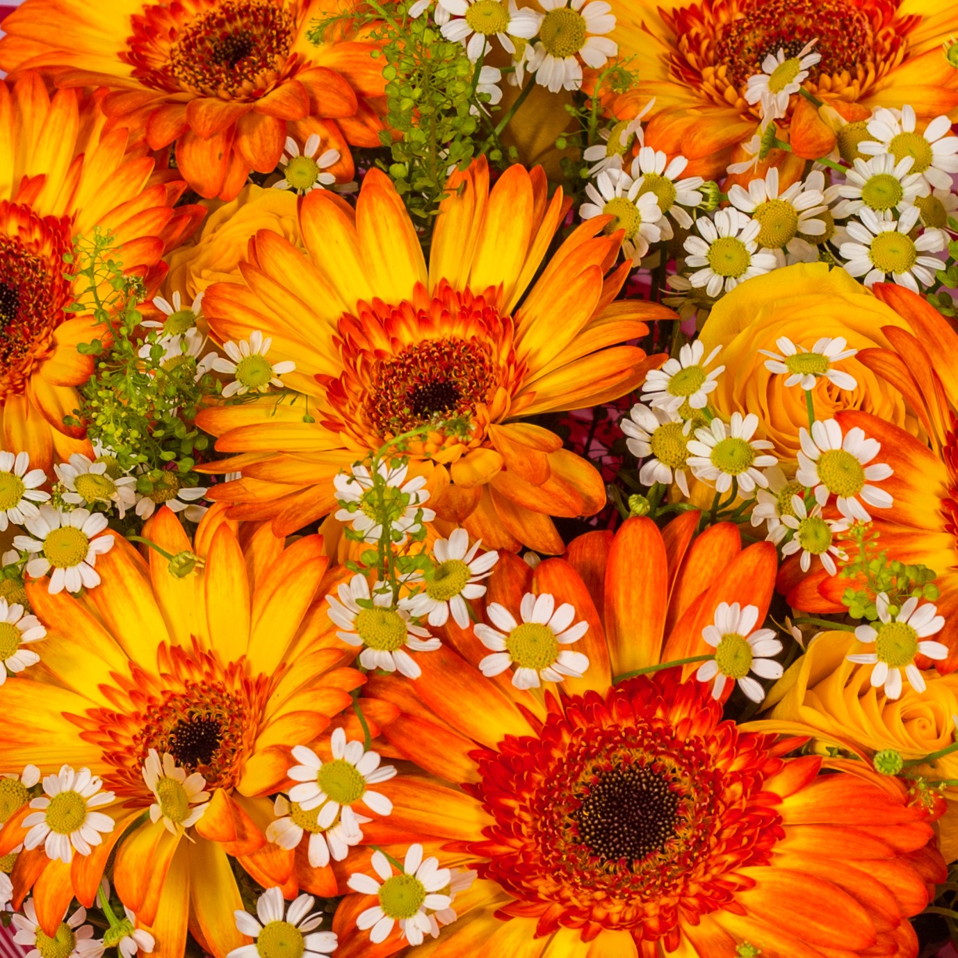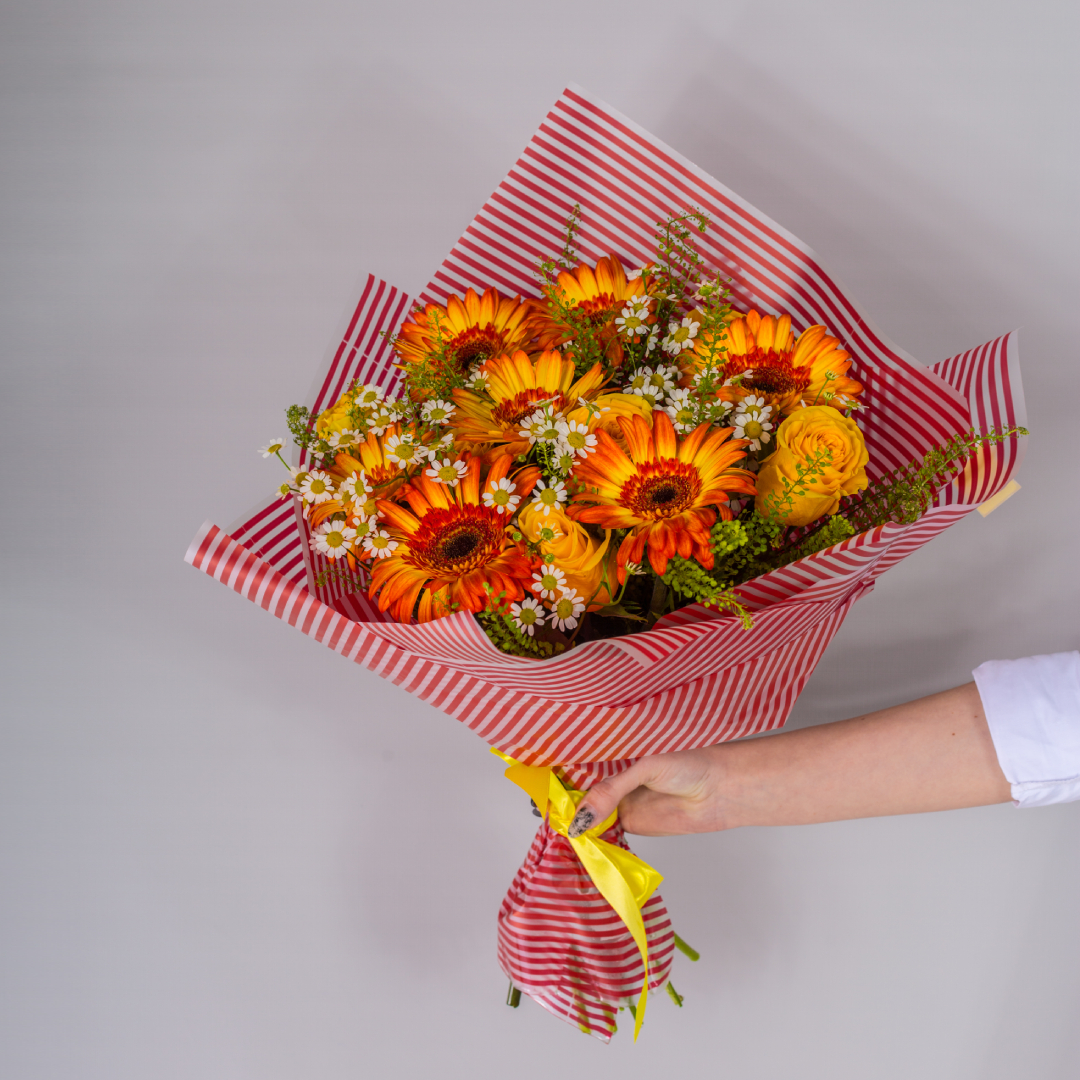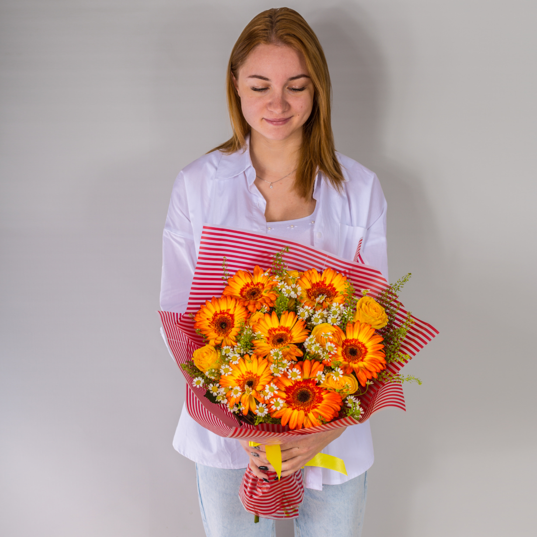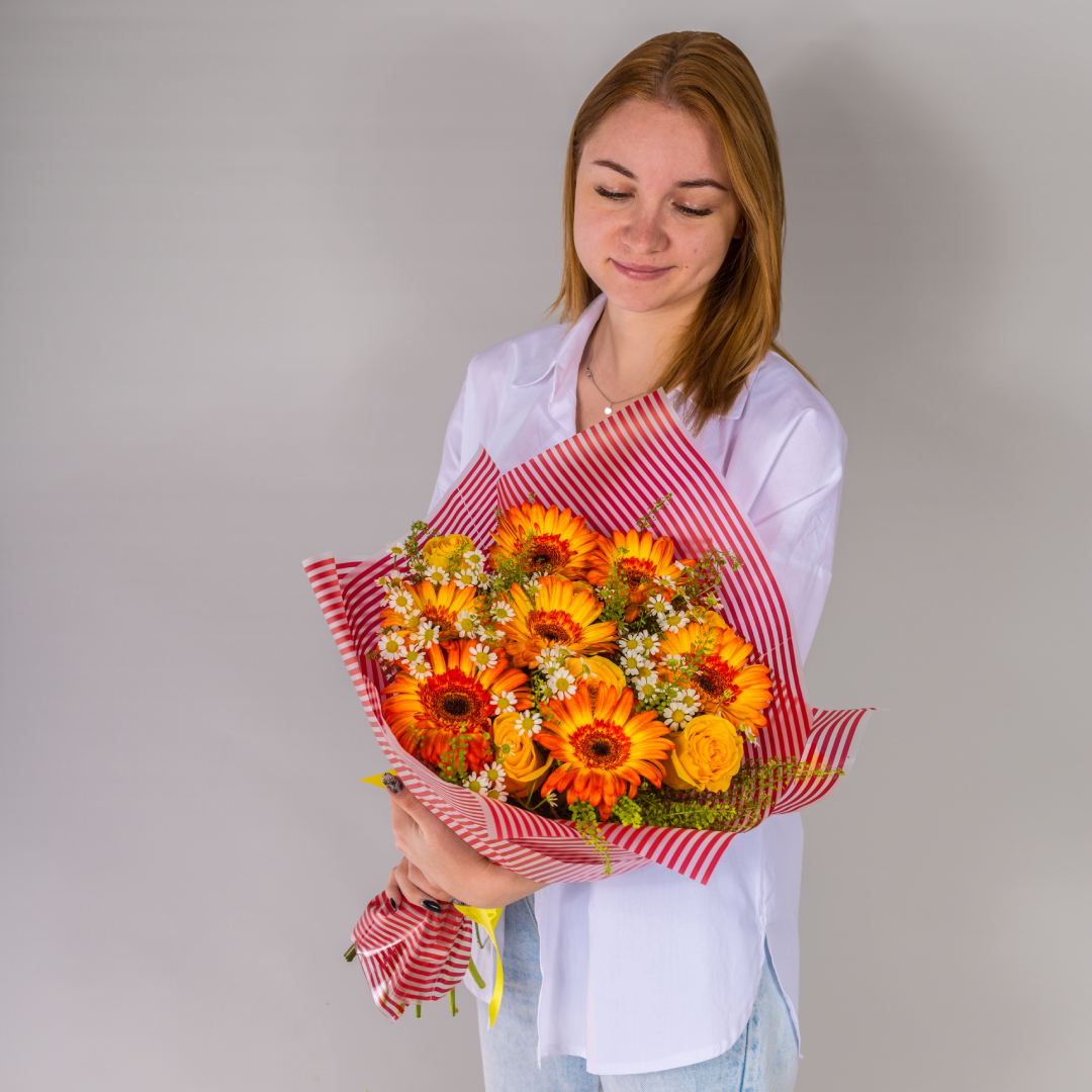 Букет из оранжевых гербер и желтых роз с ромашками арт. 52671