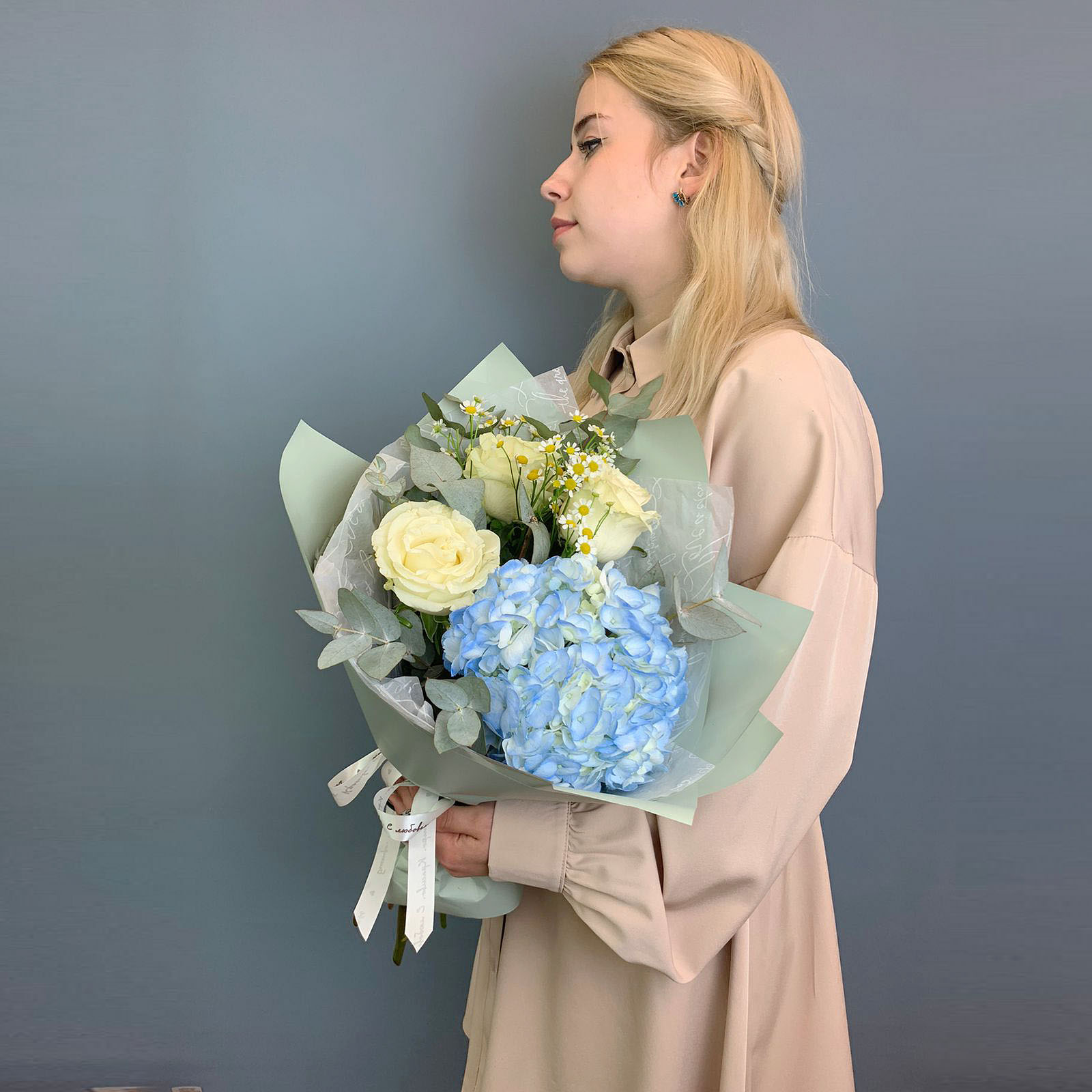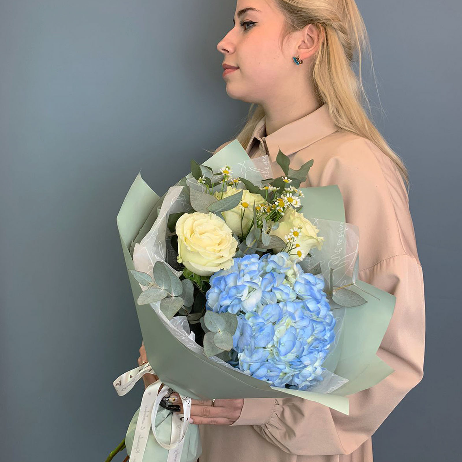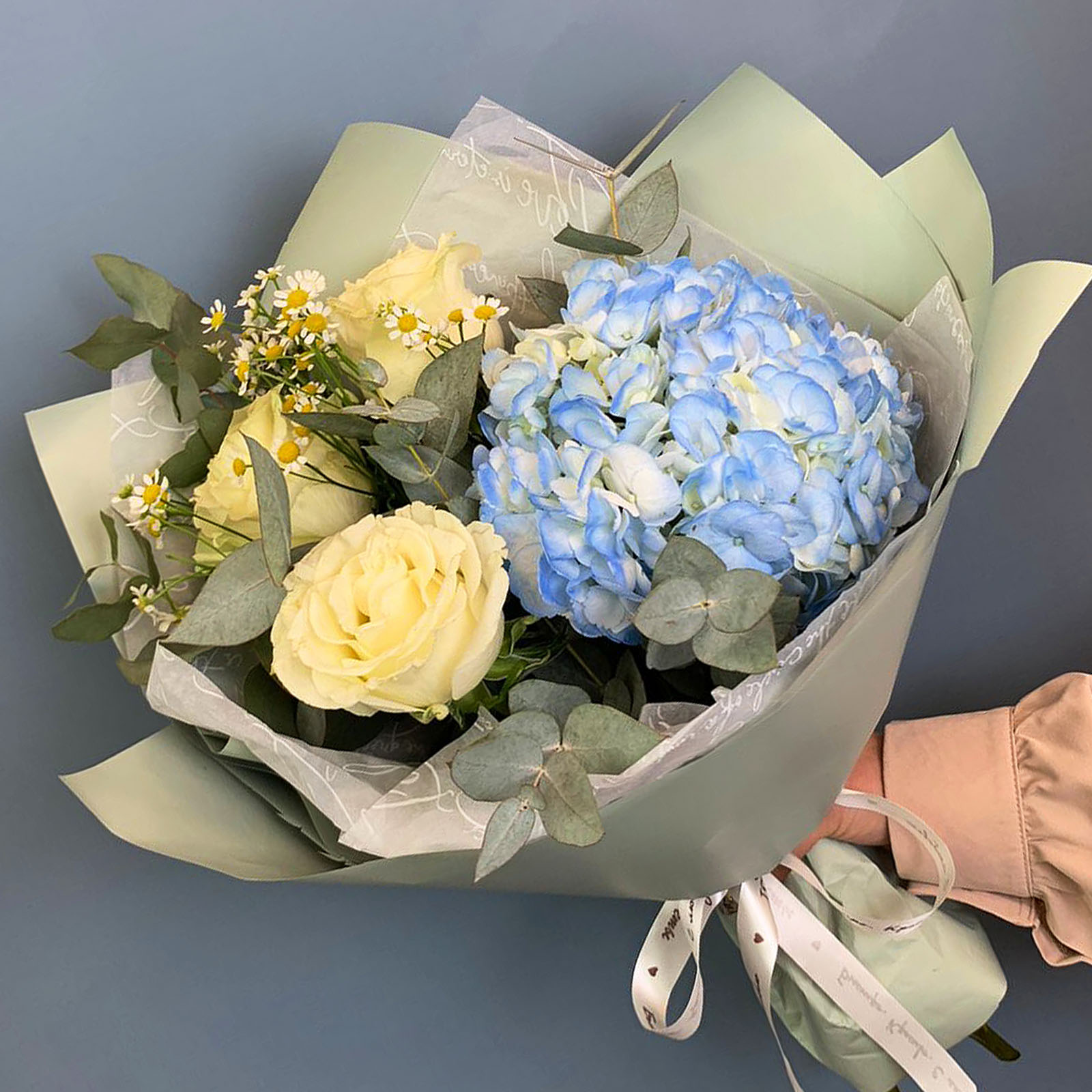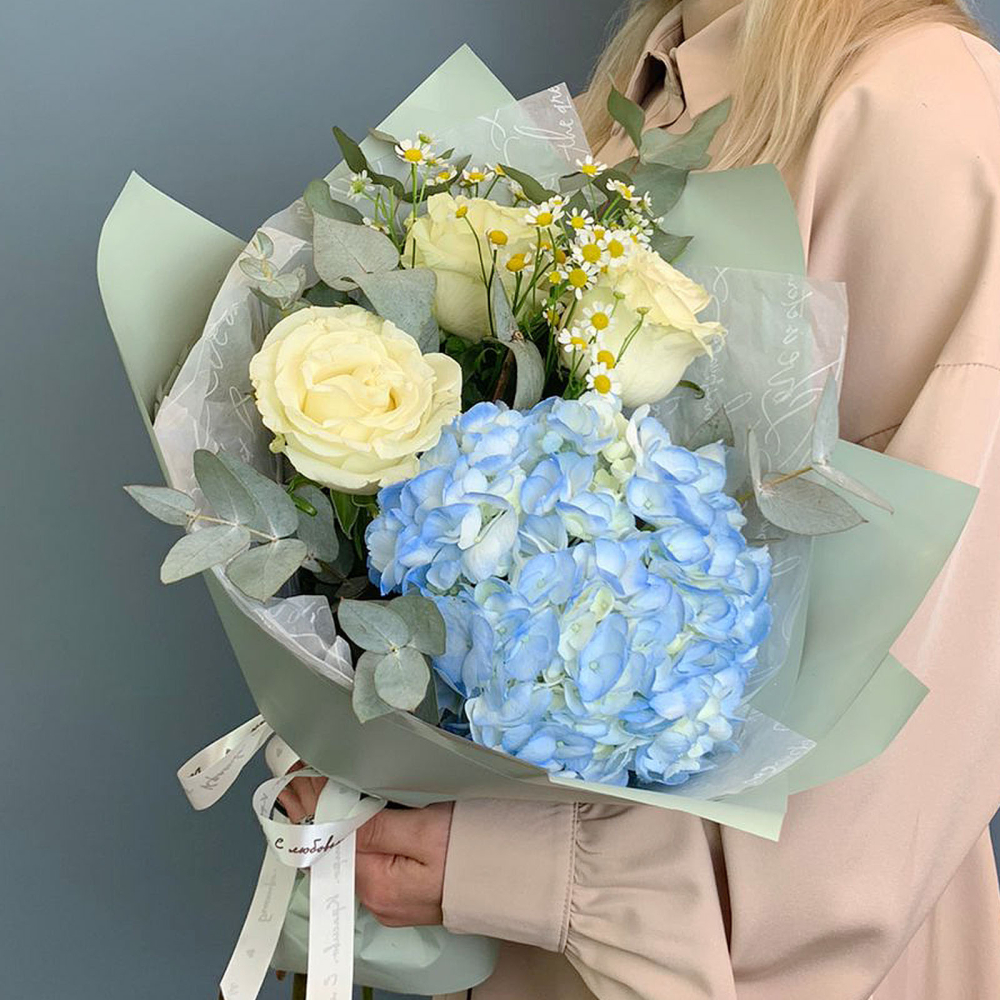 Композиция собрана на основе пышной гортензии мягкого розового оттенка и дополнена белыми эквадорскими розами сорта Мандиаль, мелкими ромашками танацетум и веточками эвкалипта. Благодаря крупной форме гортензии букет смотрится внушительно, оставаясь при этом лёгким и сбалансированным по цвету. Упакован в дизайнерскую матовую плёнку с воздушной тишью — это делает подачу особенно деликатной и современной. Размер композиции - около 40 см в высоту и 45 см в диаметре.