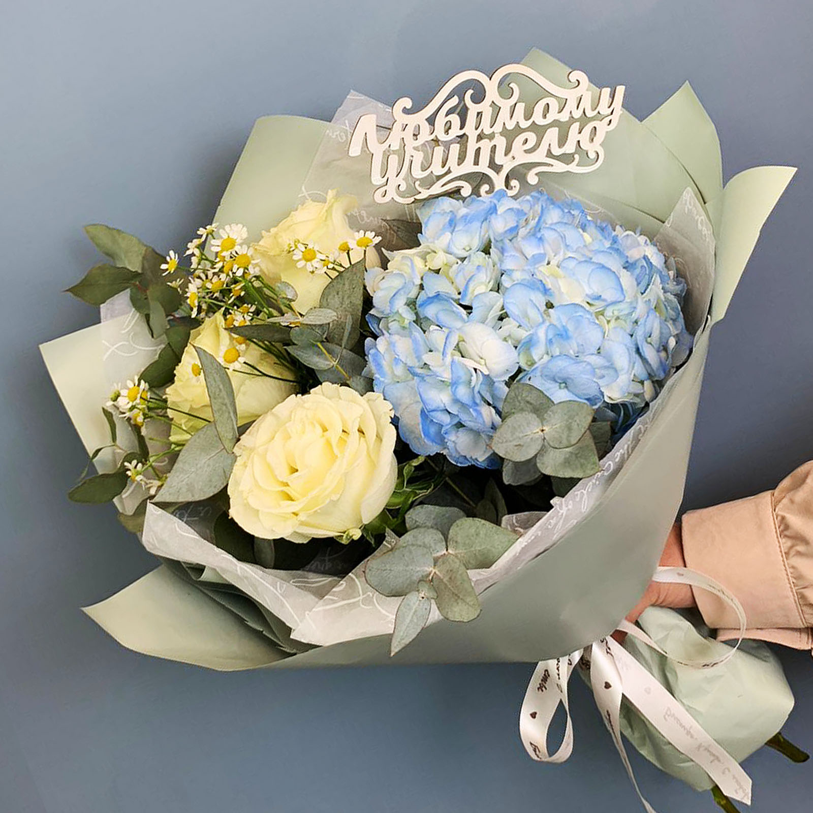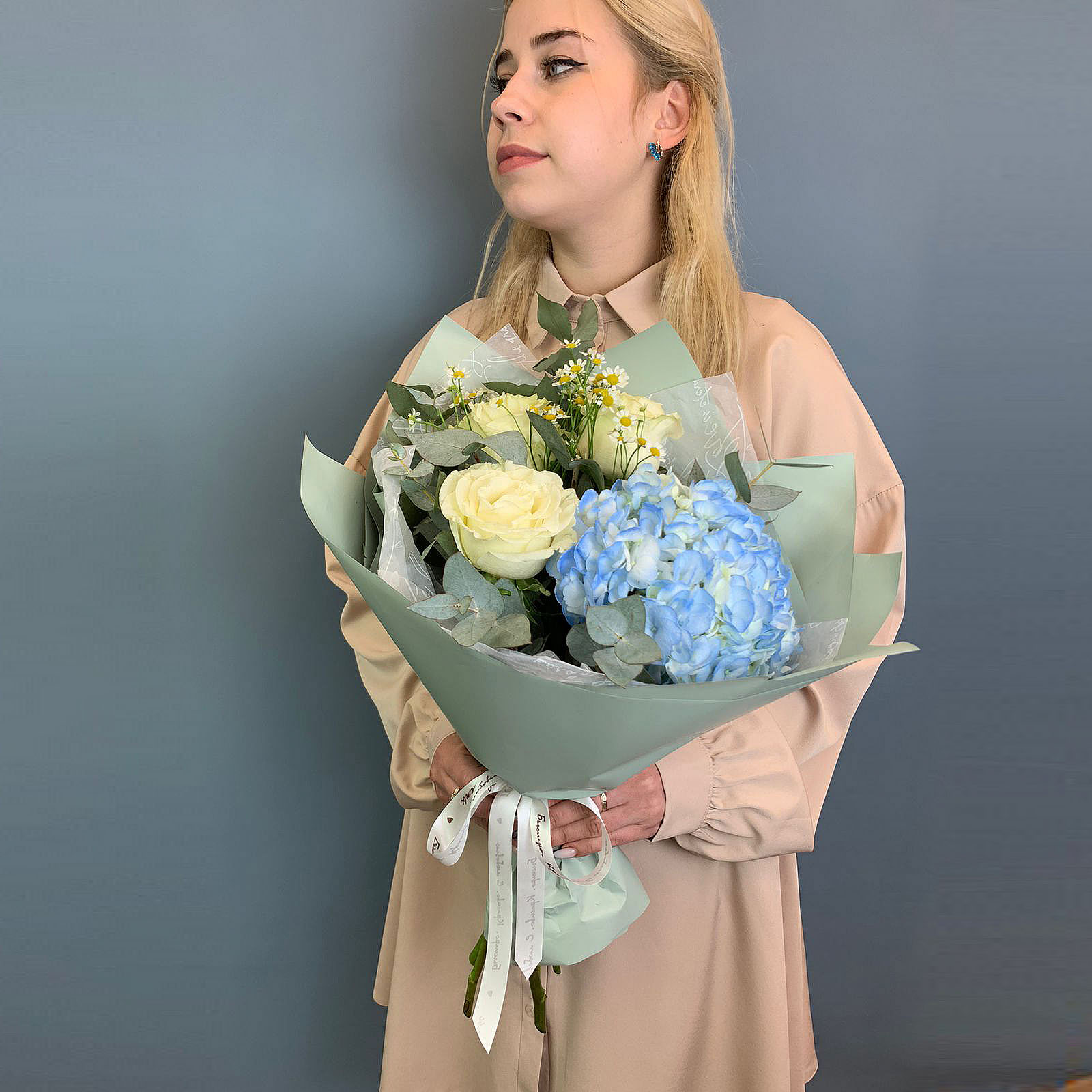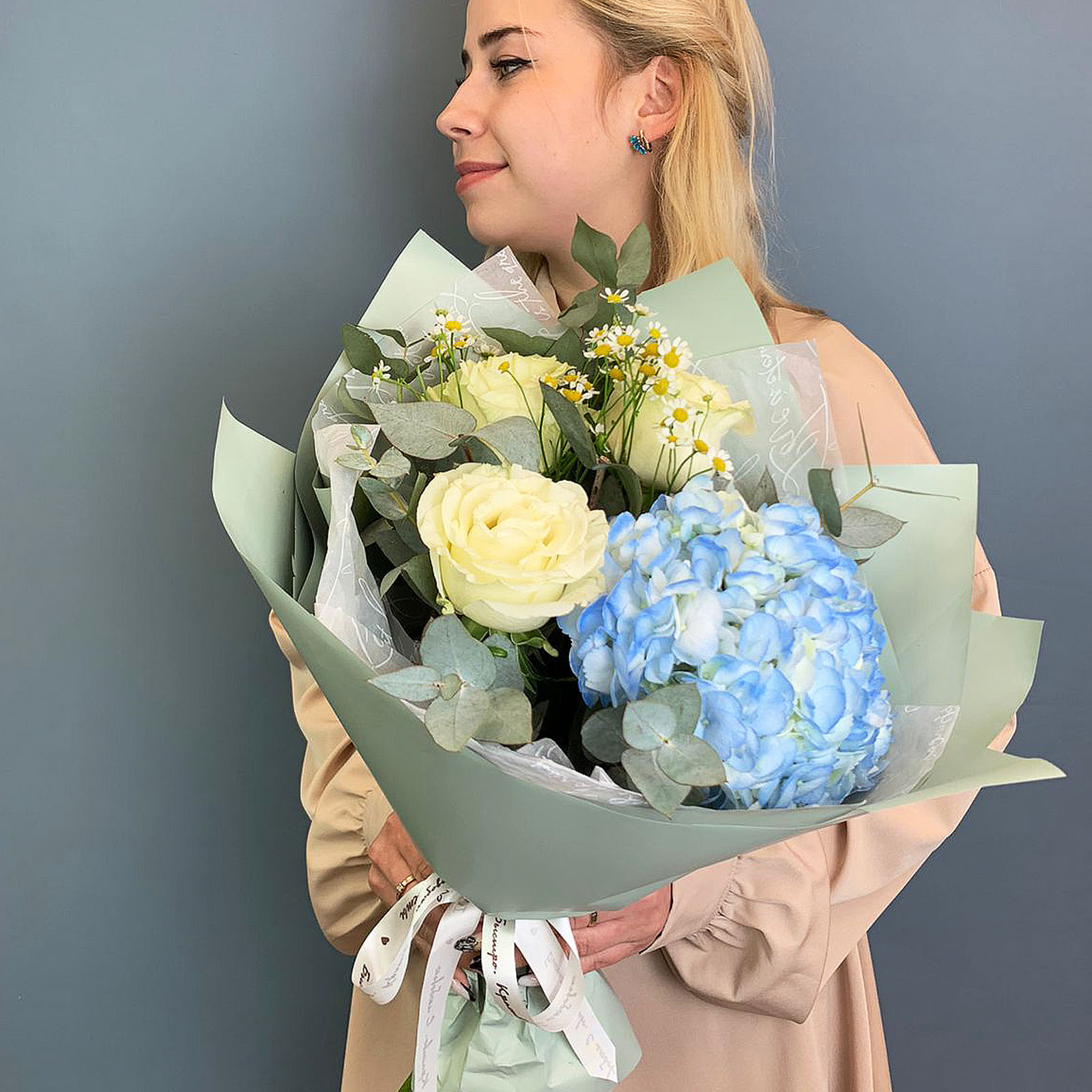 Композиция собрана на основе пышной гортензии мягкого розового оттенка и дополнена белыми эквадорскими розами сорта Мандиаль, мелкими ромашками танацетум и веточками эвкалипта. Благодаря крупной форме гортензии букет смотрится внушительно, оставаясь при этом лёгким и сбалансированным по цвету. Упакован в дизайнерскую матовую плёнку с воздушной тишью — это делает подачу особенно деликатной и современной. Размер композиции - около 40 см в высоту и 45 см в диаметре.