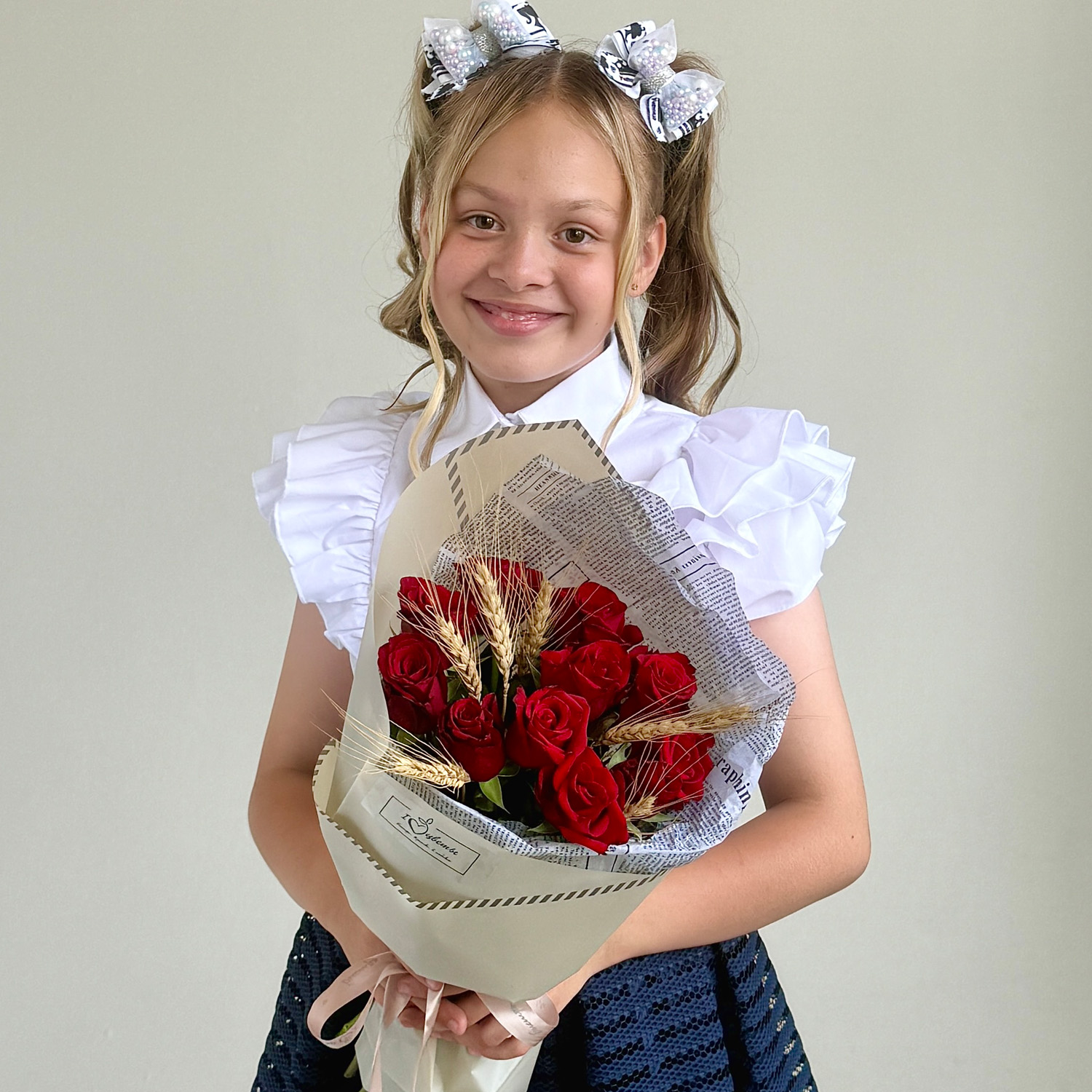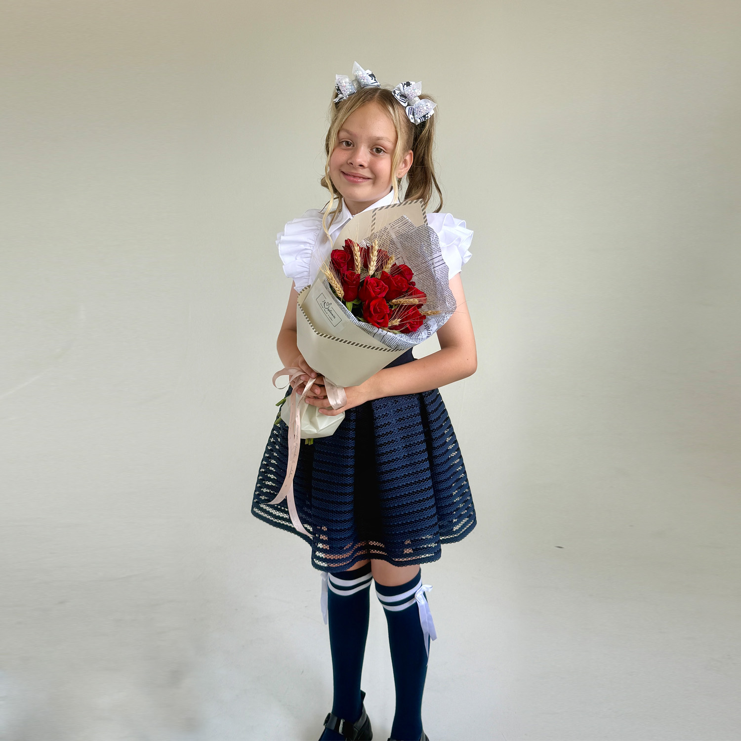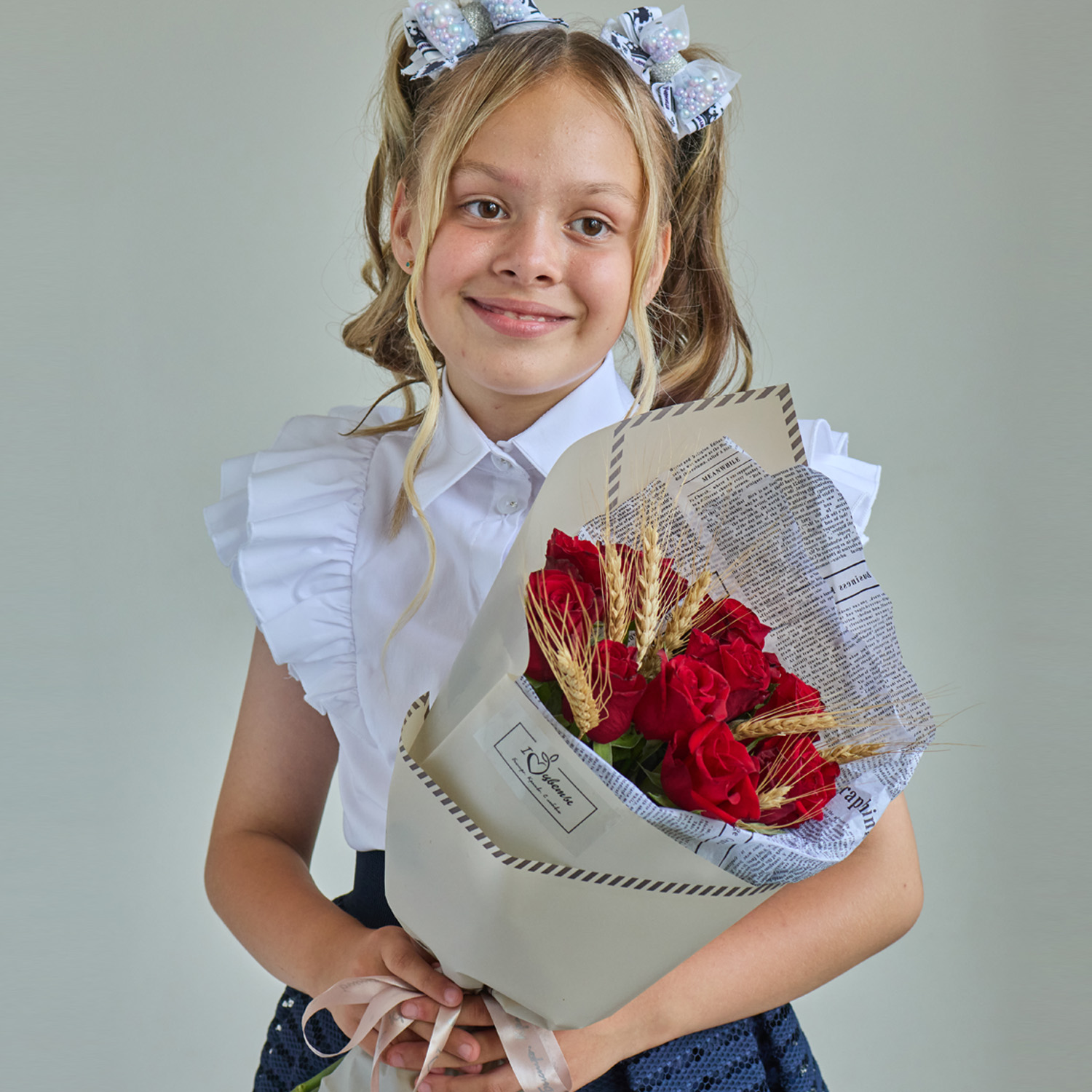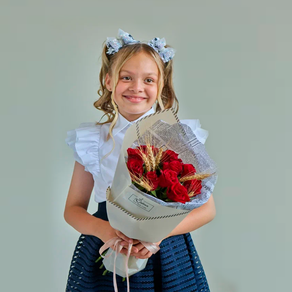 Этот букет на 1 сентября подойдёт как девочке, так и мальчику и станет индивидуальным подарком для учителя от вашего ребенка. Насыщенные оттенки роз подчеркнут торжественность момента, а стильное оформление сделает композицию запоминающейся. Дополнительно можно заказать вариант в разных расцветках, чтобы выбрать именно тот, что лучше всего подходит вашему случаю.